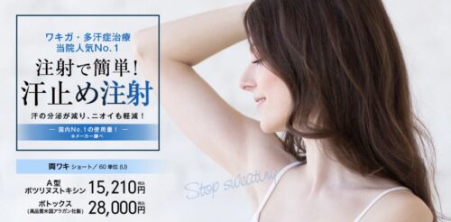 東京美容外科熊本院は、脇汗ボトックスを1回50,000円で提供しています。全3種類のボトックス製剤を用意しておいるため、予算や持続効果などあなたの希望で選択が可能です。